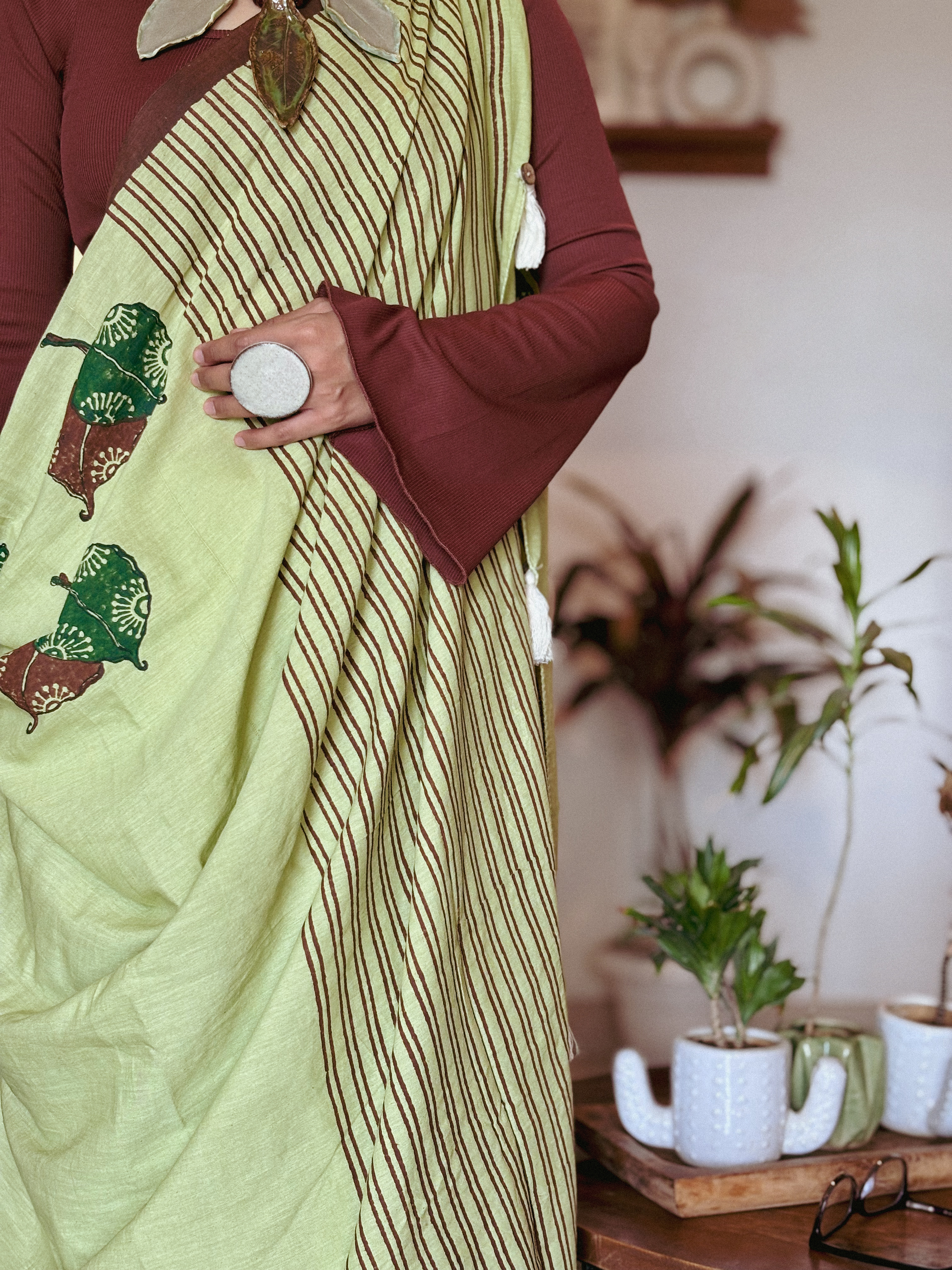 Its light leaf green hue mirrors nature’s tender whispers - of springtime hope and the quiet resilience of women. At the heart of the saree lie two hand-block printed leaves - one in rich brown, the other in lush green - placed side by side, symbolizing the duality of life.