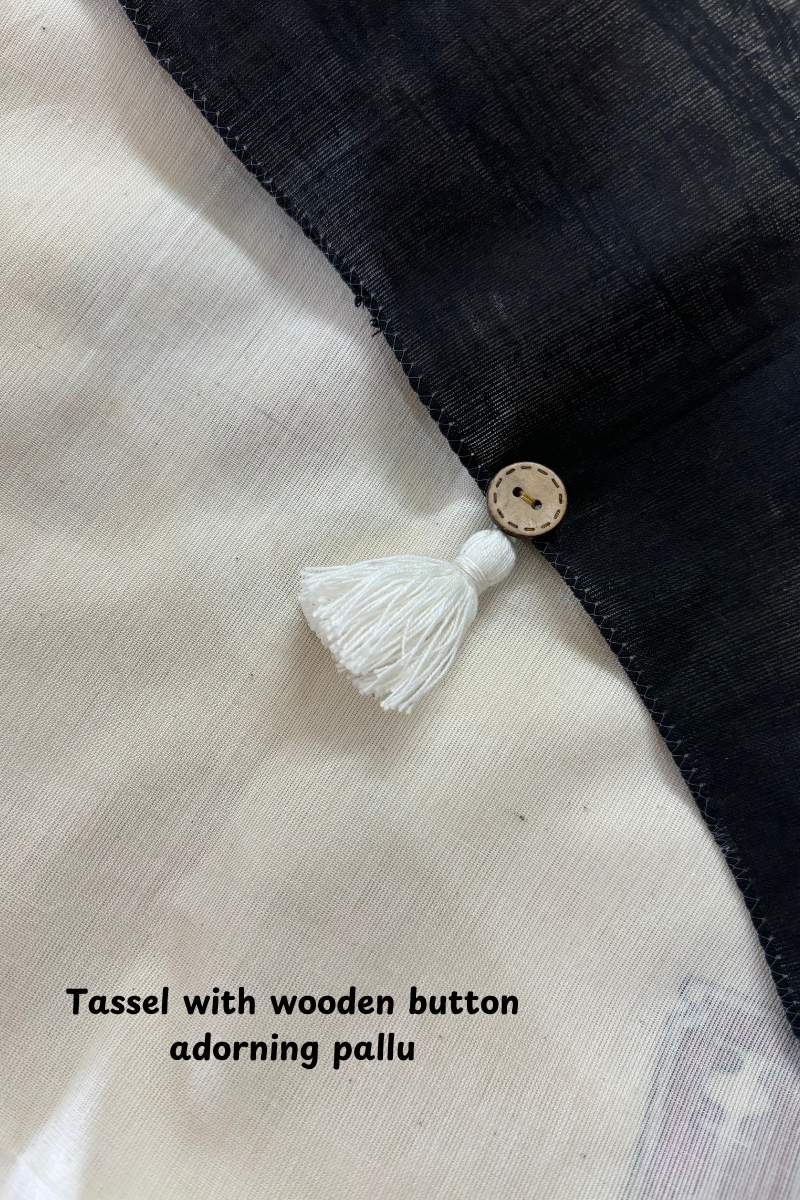The saree’s pallu is finished with delicate picko stitching and adorned with handmade cotton tassels, adding a playful yet elegant charm.